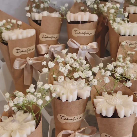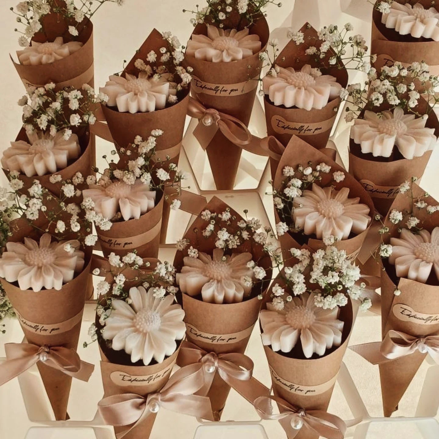 Μοναδικά κεράκια σε σχήμα μαργαρίτας, χειροποίητα από 100% φυτικό κερί σόγιας, με διακριτικό άρωμα και ρομαντική παρουσίαση. Δημιουργήθηκαν αποκλειστικά για το Hénés Partin, με σκοπό να προσφέρουν μια γλυκιά ανάμνηση στους καλεσμένους σας.