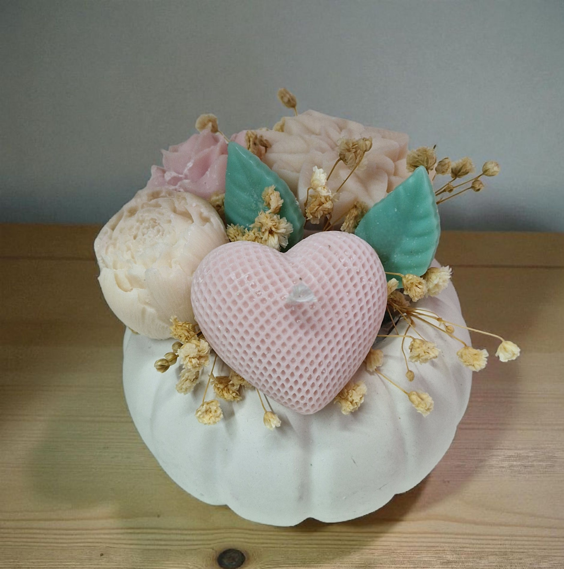 Η σύνθεση "μπουκέτο" κολοκύθα είναι διακοσμημένη σε αποχρώσεις του ροζ και του λευκού, δημιουργώντας μια ρομαντική και γλυκιά αισθητική. Περιλαμβάνει πανέμορφα διακοσμητικά λουλούδια από κερί, μικρές λεπτομέρειες από γυψοφίλη .