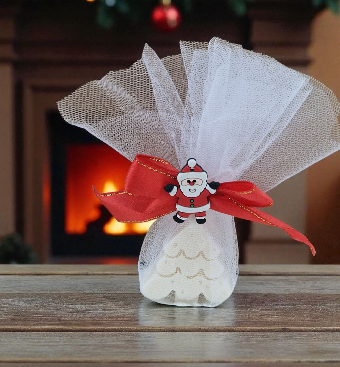 Ένα κομψό Χριστουγεννιάτικο δεντράκι με πλούσιο άρωμα με περιτύλιγμα τούλι και κορδέλα τοποθετημένη μια Χριστουγεννιάτικη φιγούρα.