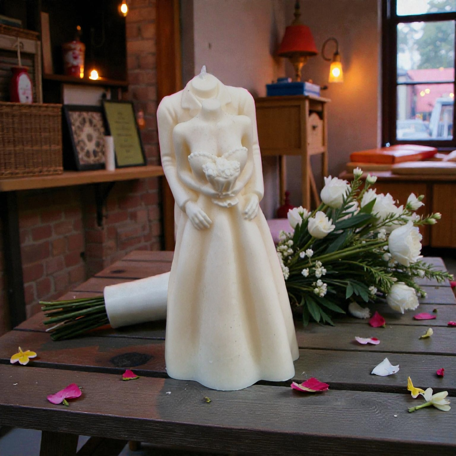 Απαθανατίστε τη στιγμή της απόλυτης ένωσης με το χειροποίητο κερί "Eternal Embrace". Ένα μοναδικό έργο τέχνης σε μορφή γλυπτού, που απεικονίζει τη νύφη και τον γαμπρό σε μια τρυφερή αγκαλιά.